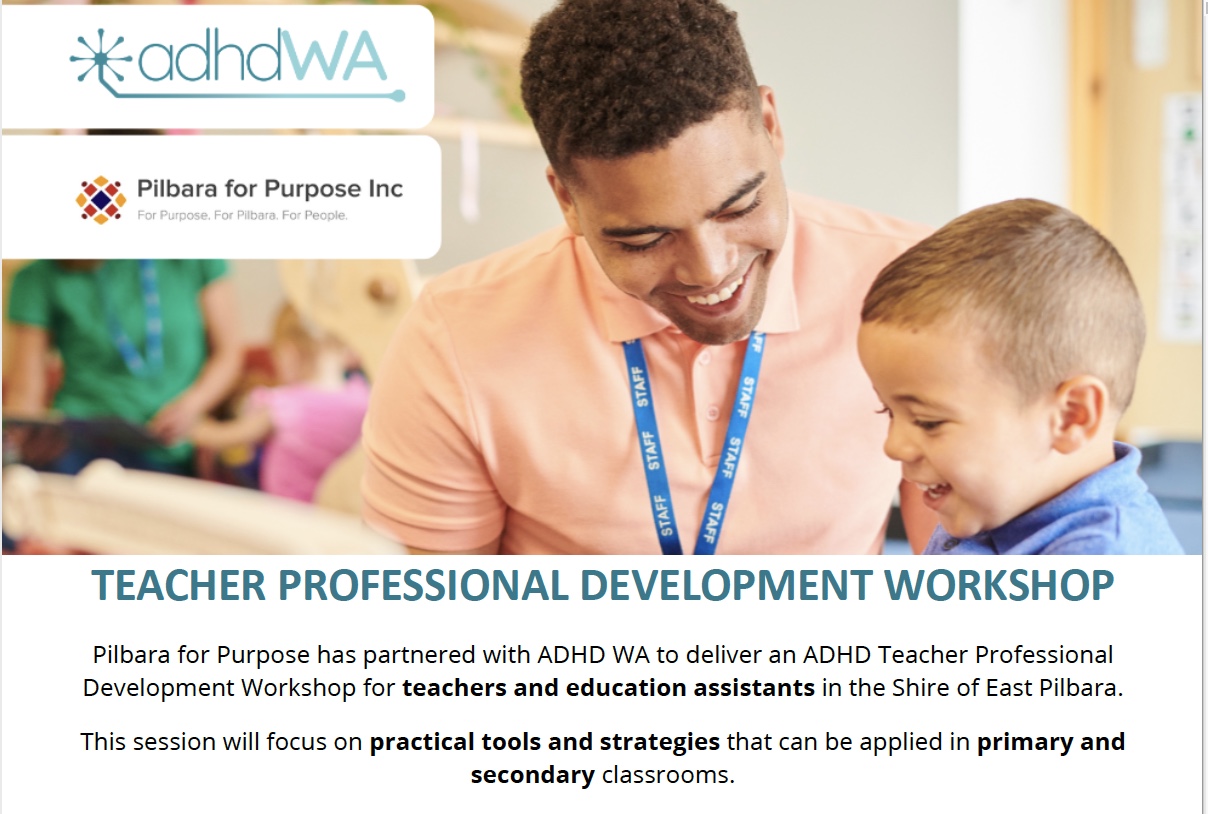 Pilbara for Purpose has partnered with ADHD WA to deliver an Online ADHD Teacher Professional Development Workshop for teachers and education assistants in the Shire of East Pilbara.